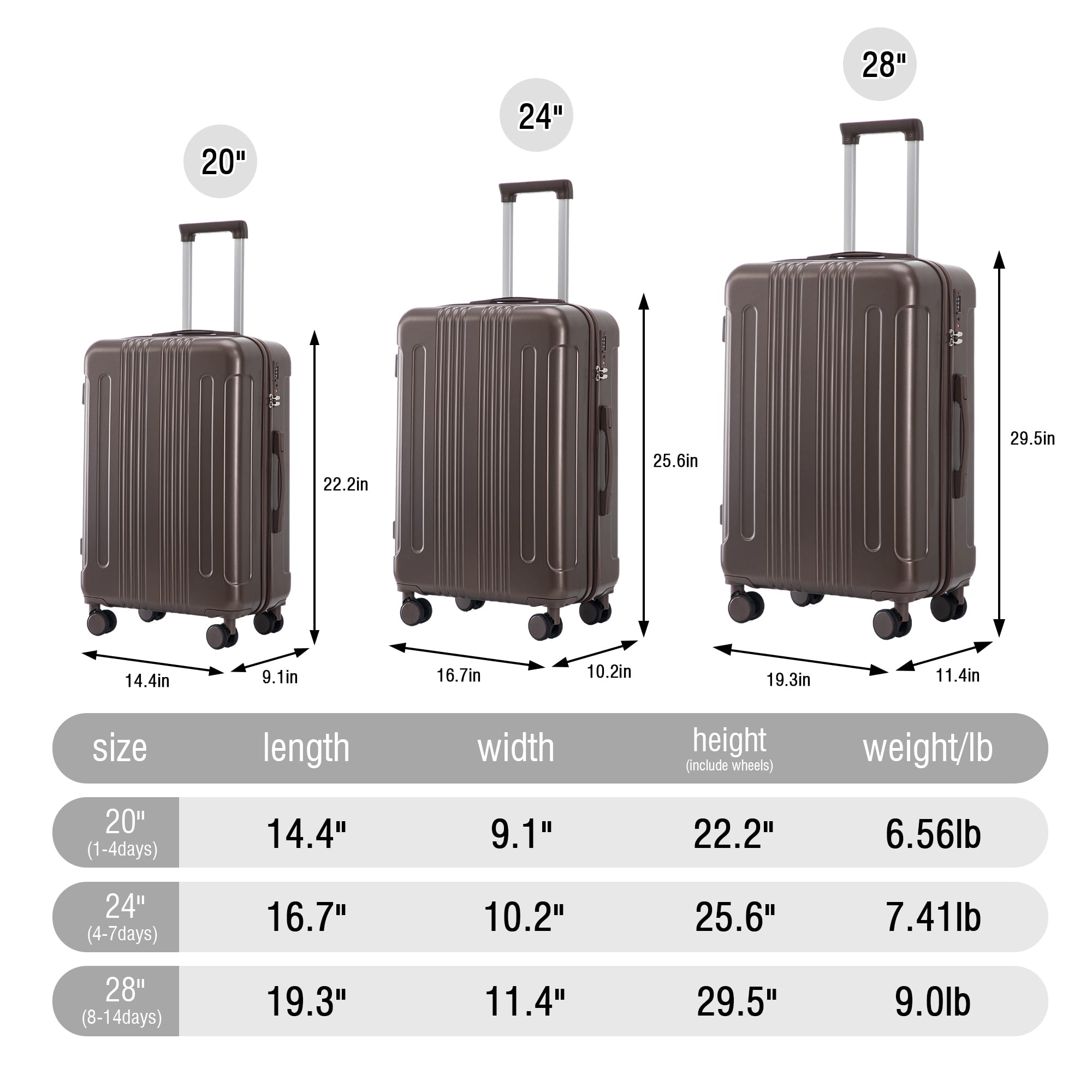 Modern Appearance:The stylish and smooth vertical stripe design of the rolling luggage makes it more resistant to pressure and wear and brings a good mood to your journey. It includes four molded side feet, they allow the luggage to remain upright even when standing on its side.