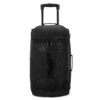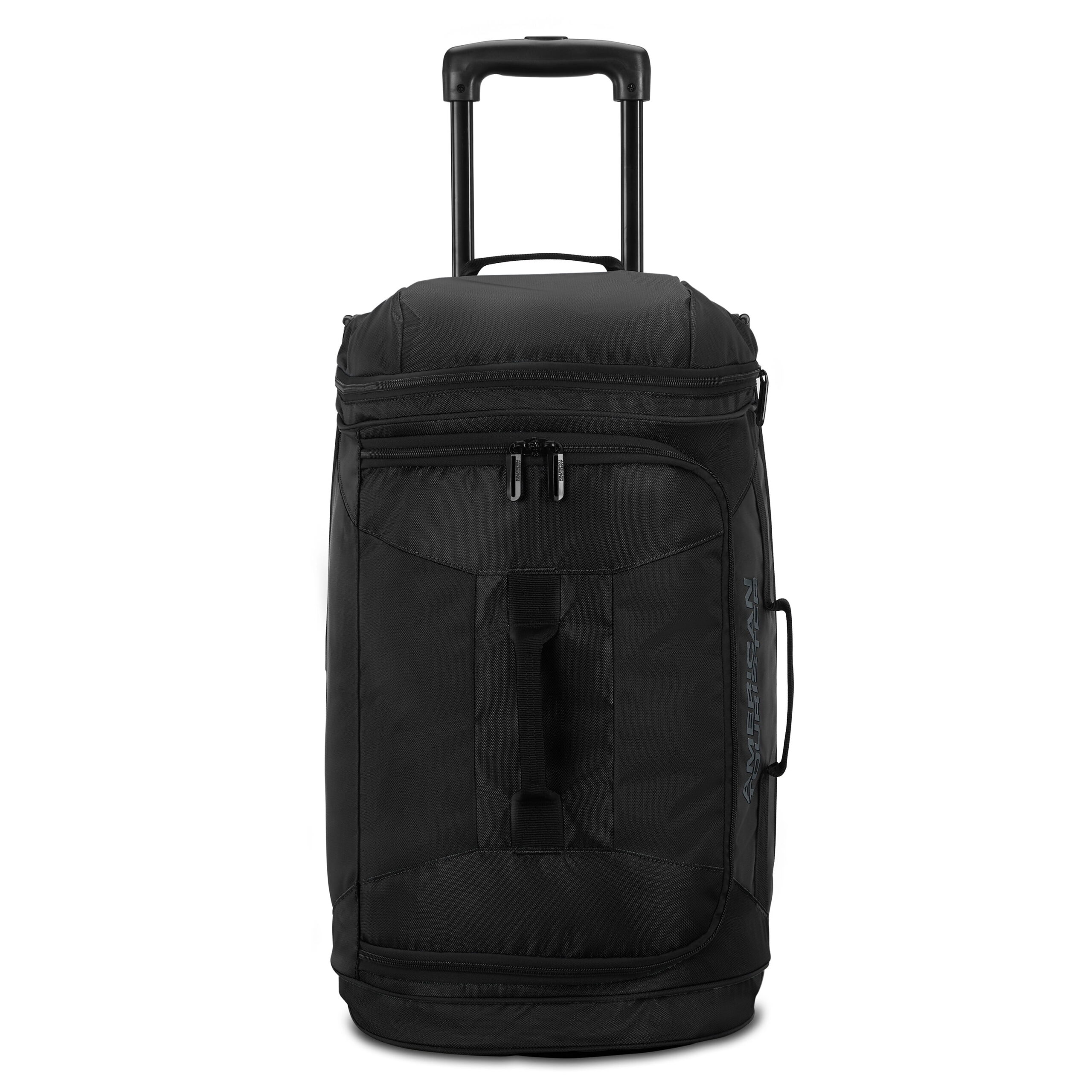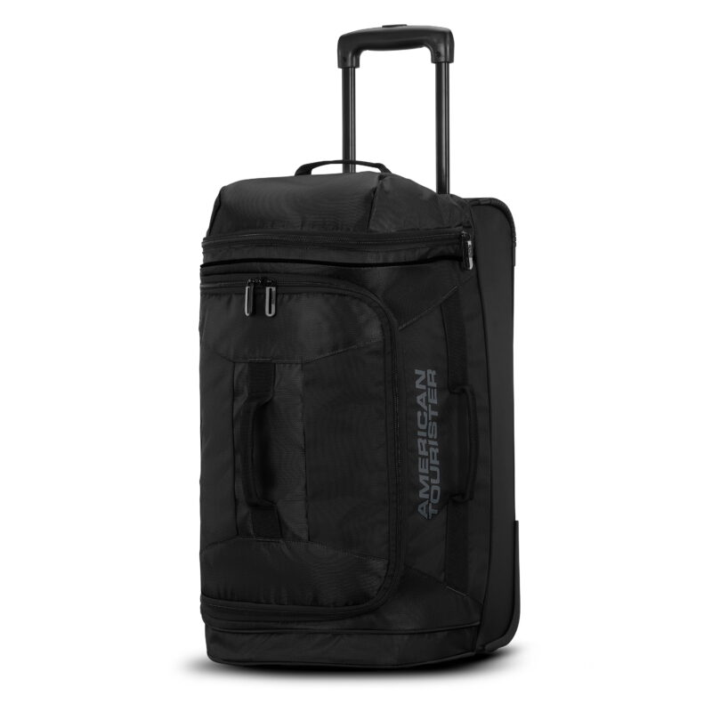 Travel effortlessly with the American Tourister Black carry on duffel bag. With a push-button handle and inline skate wheels, maneuvering is easy and smooth. The large drop-bottom compartment keeps items organized, while the U-shaped opening allows for convenient packing. Ideal for weekend getaways, designed for ease and durability.