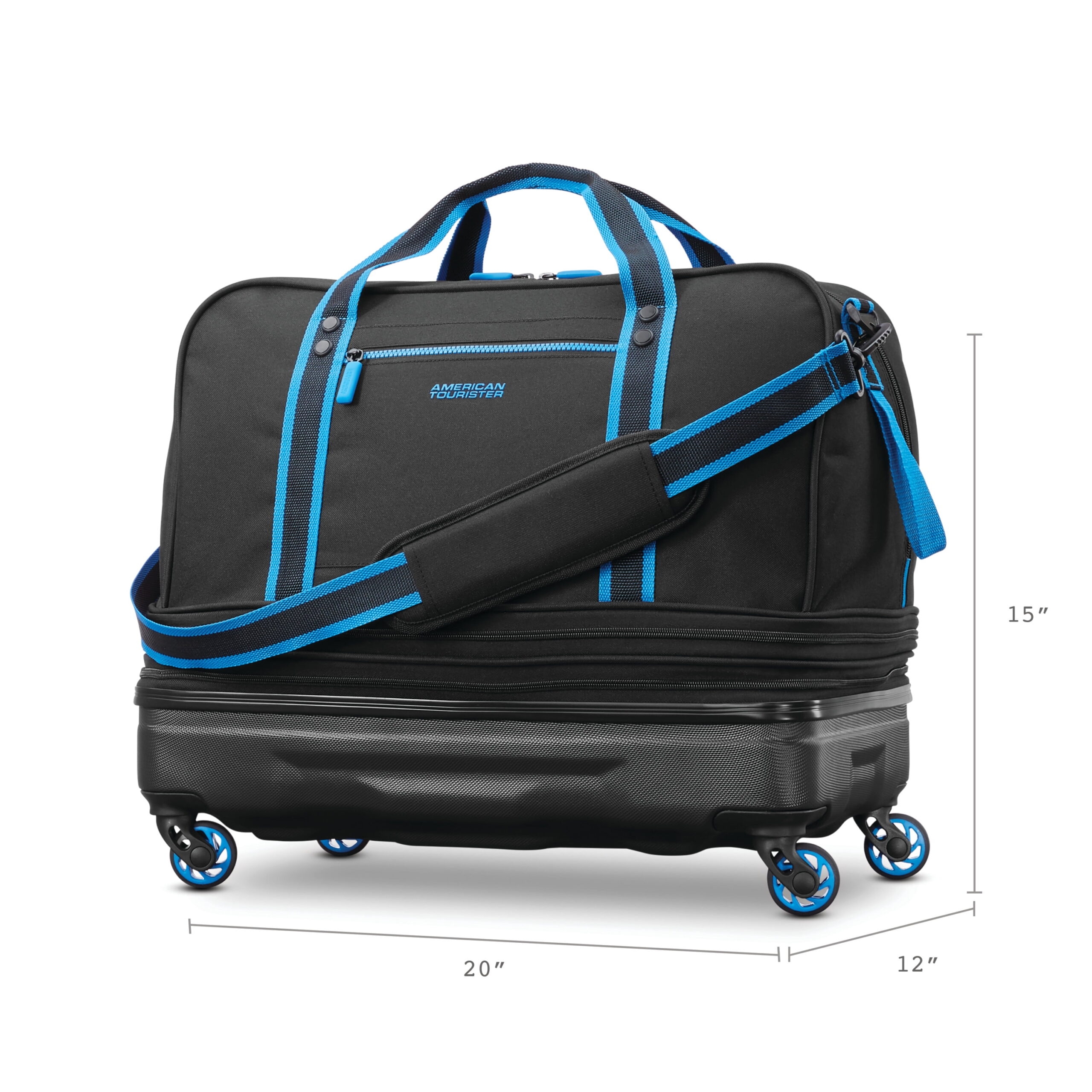 American Tourister’s Exo Hybrid Softside rolling duffel design expands to 2 larger sizes when extra room is needed. The Exo Hybrid Softside rolling duffel is built with durable polyester with blue accent. The duffel has four sturdy in-line wheels which keep it easy to move. It has interior access zip opening, large main compartment and side pocket for easy access to your items while traveling.
