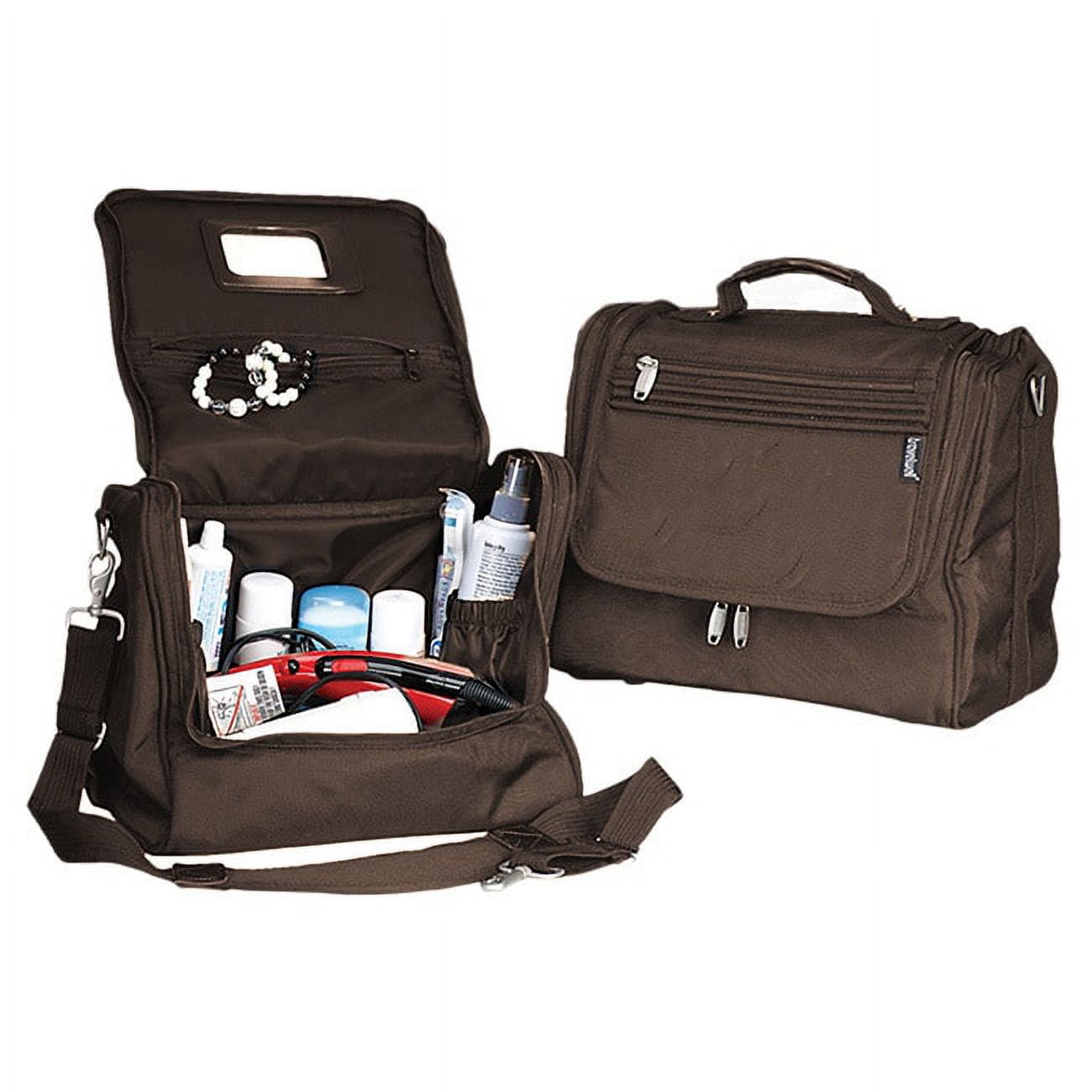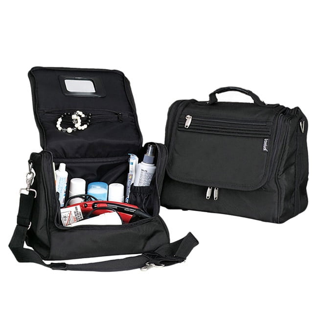 The Zip Around Cosmetic Tote is made of 1680D Ballistic Nylon, and is available in black or brown. This tote bag features a main compartment with two open elastic pockets, four elastic strap holes for bottles, a zip pocket for jewelry (that includes a mirror!), and an outside zip pocket. Carry in comfort with foam padding all around, and a detachable, adjustable shoulder strap.