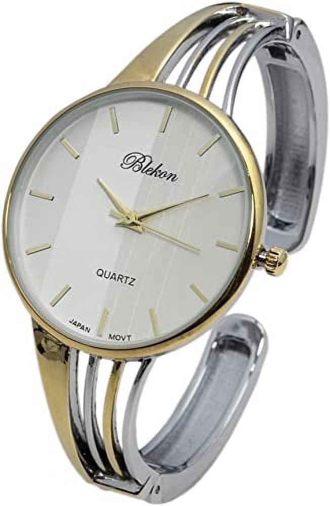 Blekon Collections Quartz Women’s 34mm Case Elegant Cuff Bangle Watch. This stylish timepiece features a sophisticated round dial and is designed for both elegance and functionality. Crafted with advanced quartz movement, it ensures precise timekeeping, while the durable stainless steel snap-off back case provides exceptional resilience against daily wear. The cuff bangle design offers a comfortable fit for wrists measuring 6 to 7 inches, making it suitable for all-day wear. With a case size of 34mm and a thickness of 10mm, this watch boasts a refined silhouette. It’s also engineered to be water-resistant, allowing it to withstand minor splashes during everyday activities.
