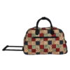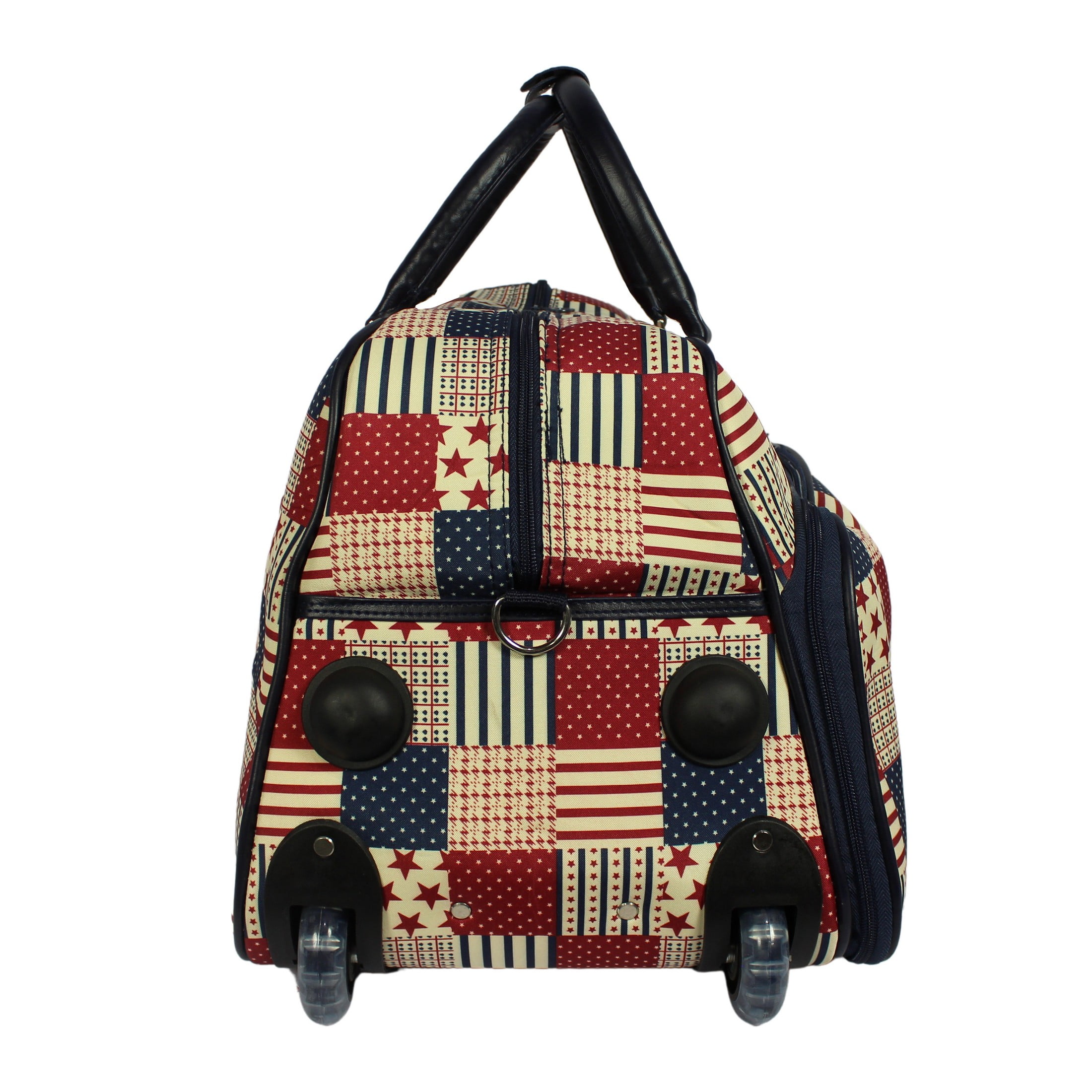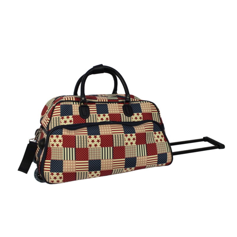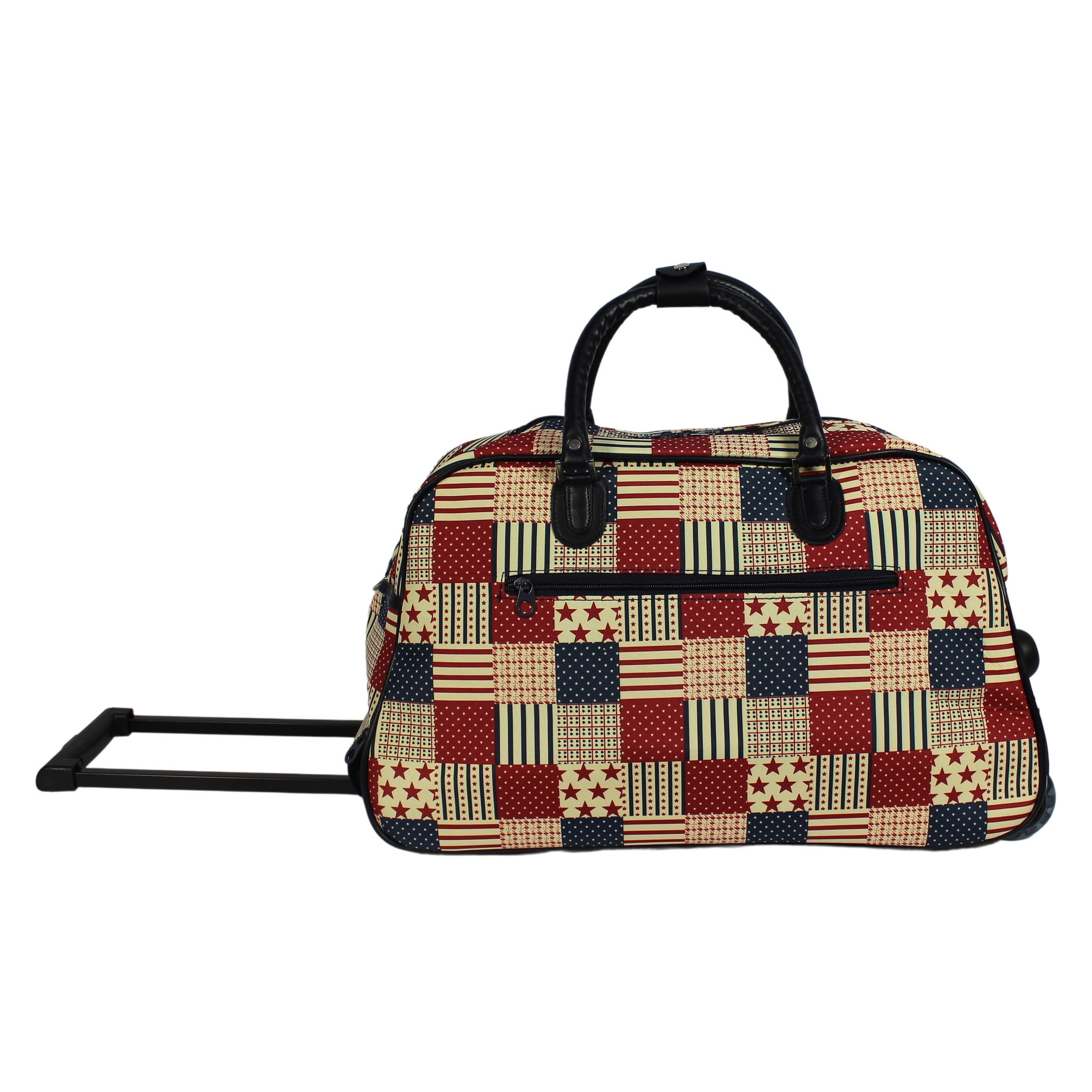 This fashion-forward CalBags rolling duffel bag makes a fashion statement and it is ready for anything. Offering a fully lined interior, retractable handle and more must-have features, this bag has the makings of an ideal travel companion. The large top zipper opening allows easy access to the roomy interior and exterior pockets keep small items in easy reach. Featuring two handles and a detachable shoulder strap; this duffle offers flexible carrying options. This grab-and-go bag gives you a structured shape and vibrant patterned exterior to fit your lifestyle and express your personality. Take on whatever travel may bring with this rolling duffel bag.