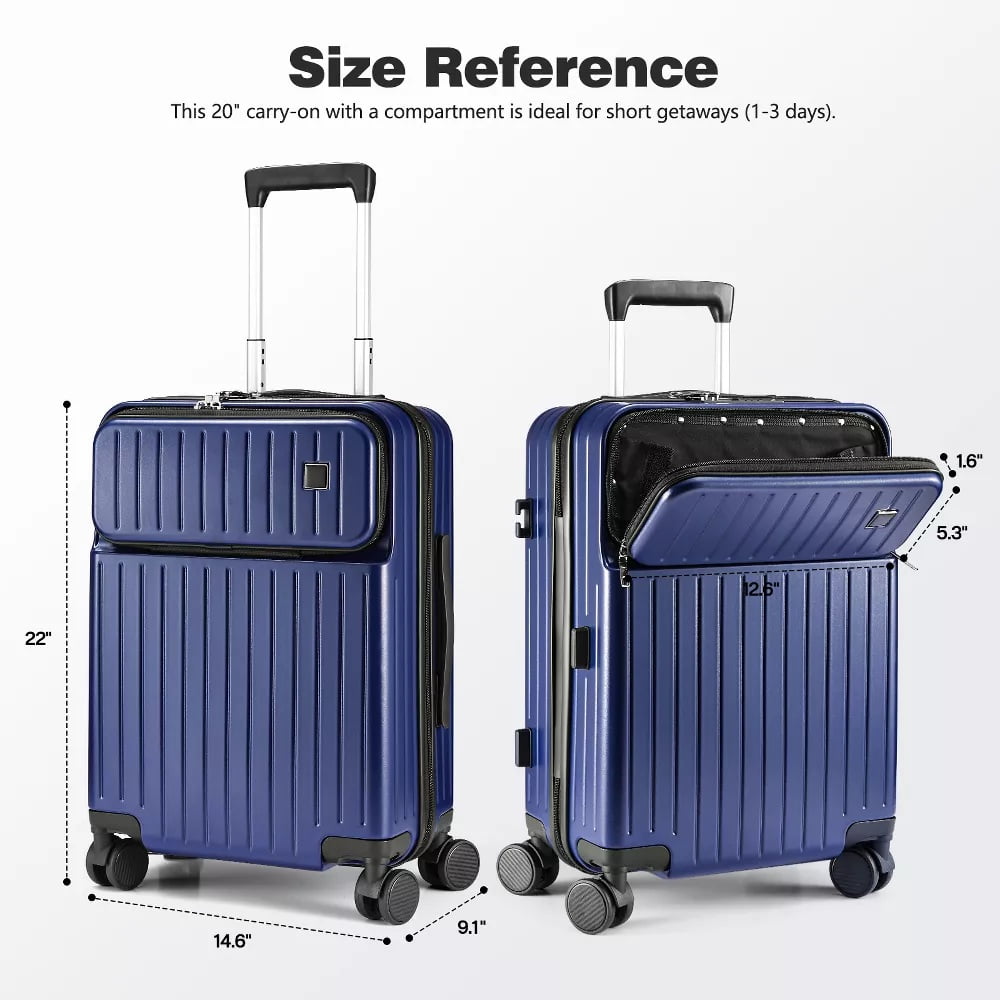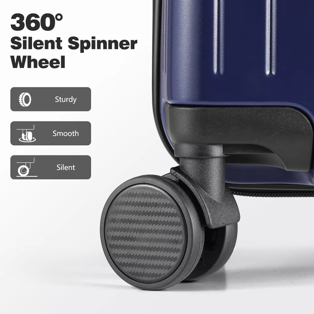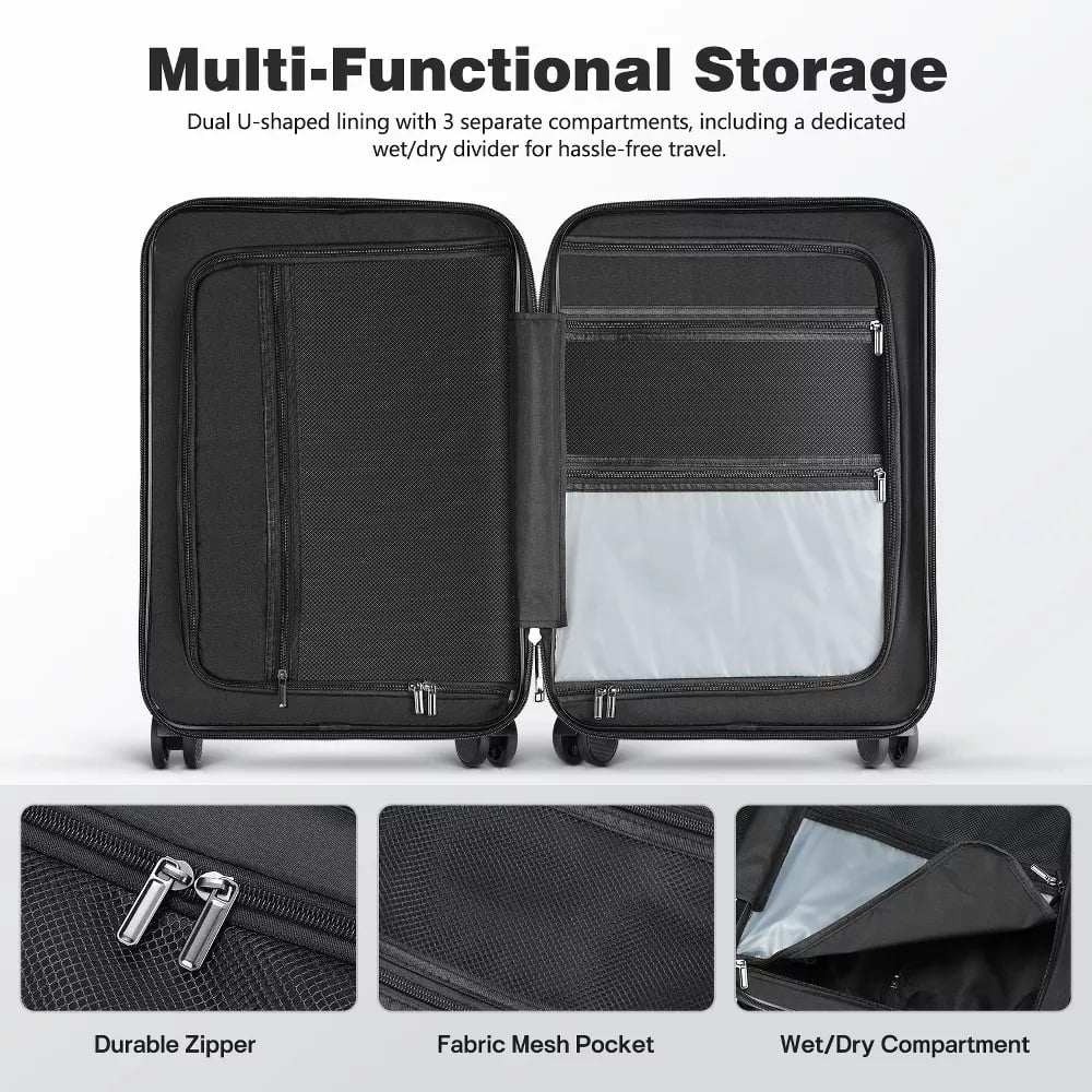 This 20″ suitcases is perfectly suited for any trip. Designed with a built-in TSA-approved lock, 360掳 silent spinner wheels, and a reinforced aluminum frame with corner guards, it offers exceptional convenience, durability, and performance. Whether for business travel or a vacation getaway, this lightweight set ensures a smoother, more comfortable journey. The front pocket is ideal for storing laptops or passports while keeping shoes, toiletries, and tech accessories neatly organized and separated, which achieves overall durability.
