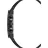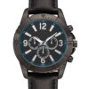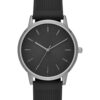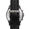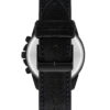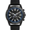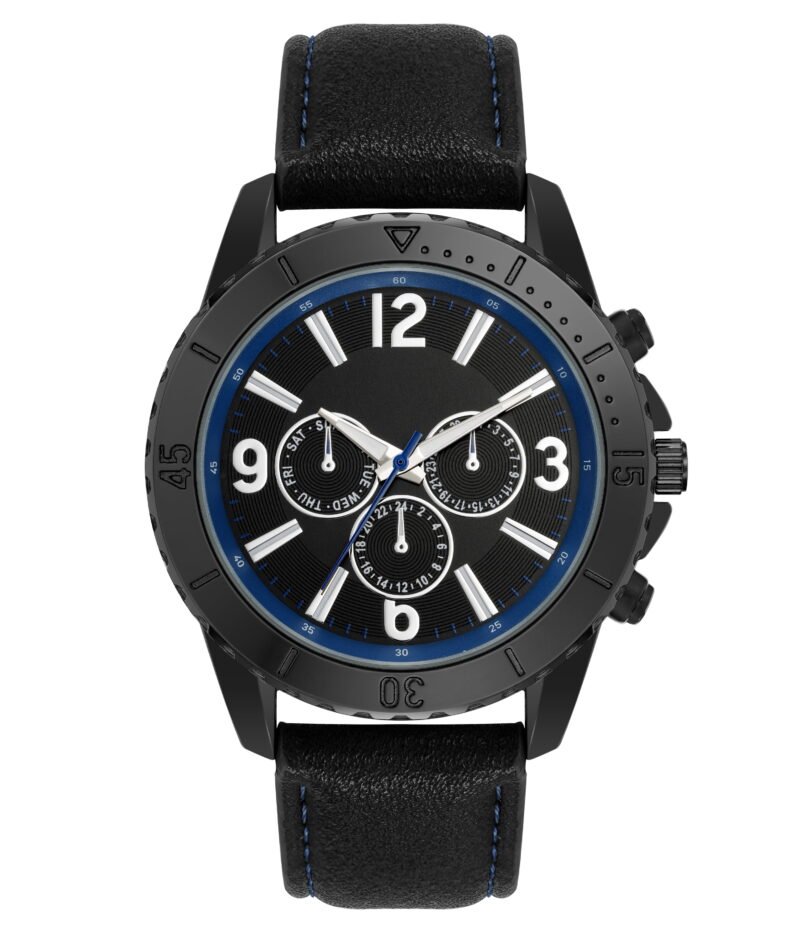 Presenting a sleek 45mm round alloy case with a polished finish, this watch boasts fixed lugs, crown guard, and faux pushers for added style. The navy sloped reflector ring with white hour markings complements the black sandblast dial, featuring UP Arabic numerals and tapered stick indexes. The timepiece is completed with a smooth black PU strap, padded and edged with navy stitching, and nickel skeleton hands for a contemporary and sophisticated look.