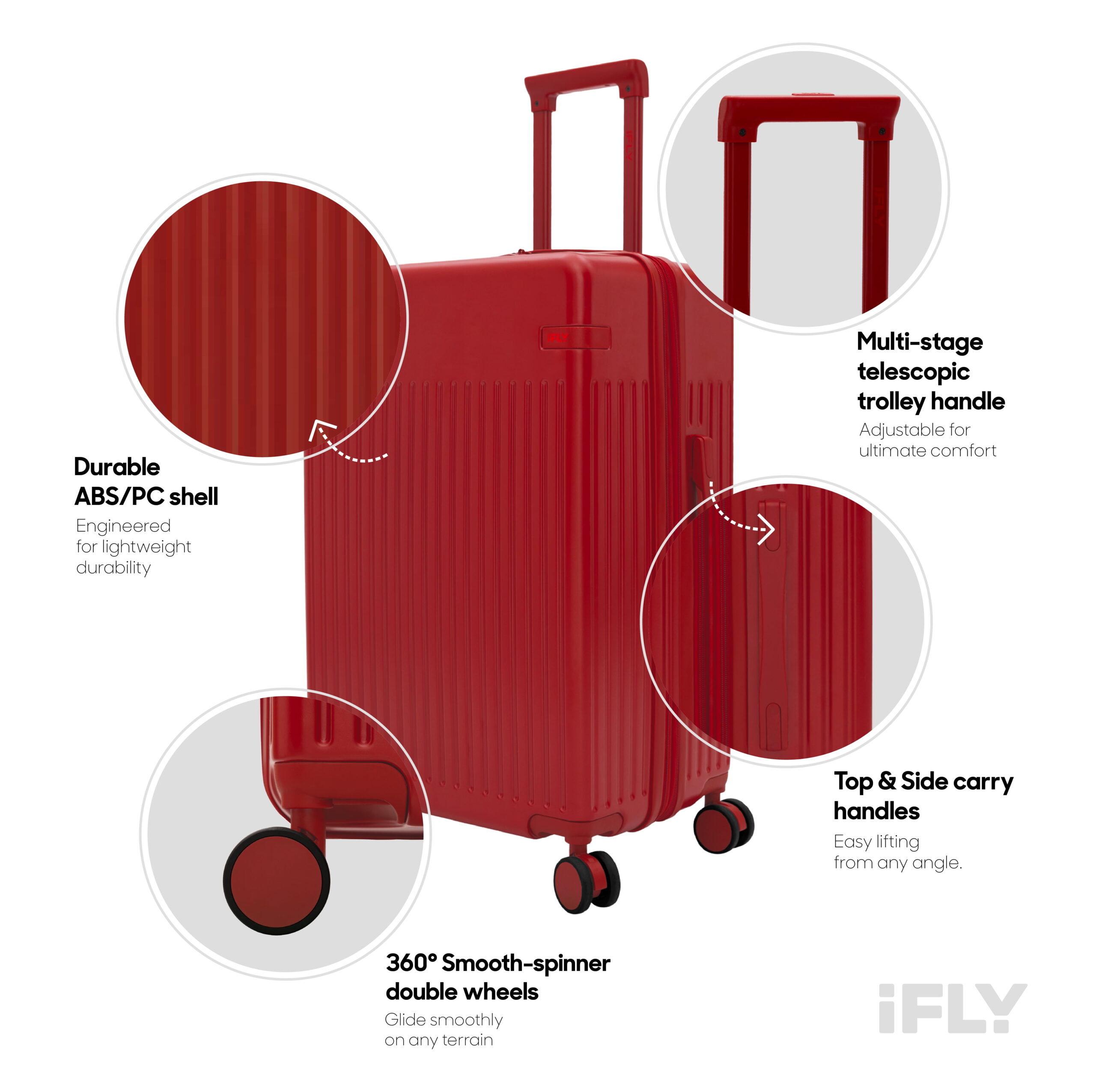 Travel in style with the iFLY Transit Luggage Collection, available in bold Red or sleek Blue in carry-on, medium, or large checked sizes. Built for effortless travel with double spinner wheels and a multi-stage telescopic handle, plus smart interior organization with tie-down straps, an integrated wet pocket, and multiple compartments. Durable, lightweight, and backed by iFLY’s 20-year warranty, the Transit Collection makes every trip smoother.