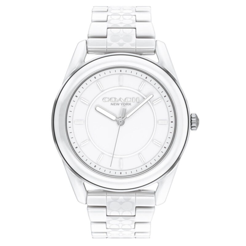 The Preston watch is an elegant pick for every day. Finished with stainless steel accents, this white ceramic design features a bracelet etched with the Coach Signature.