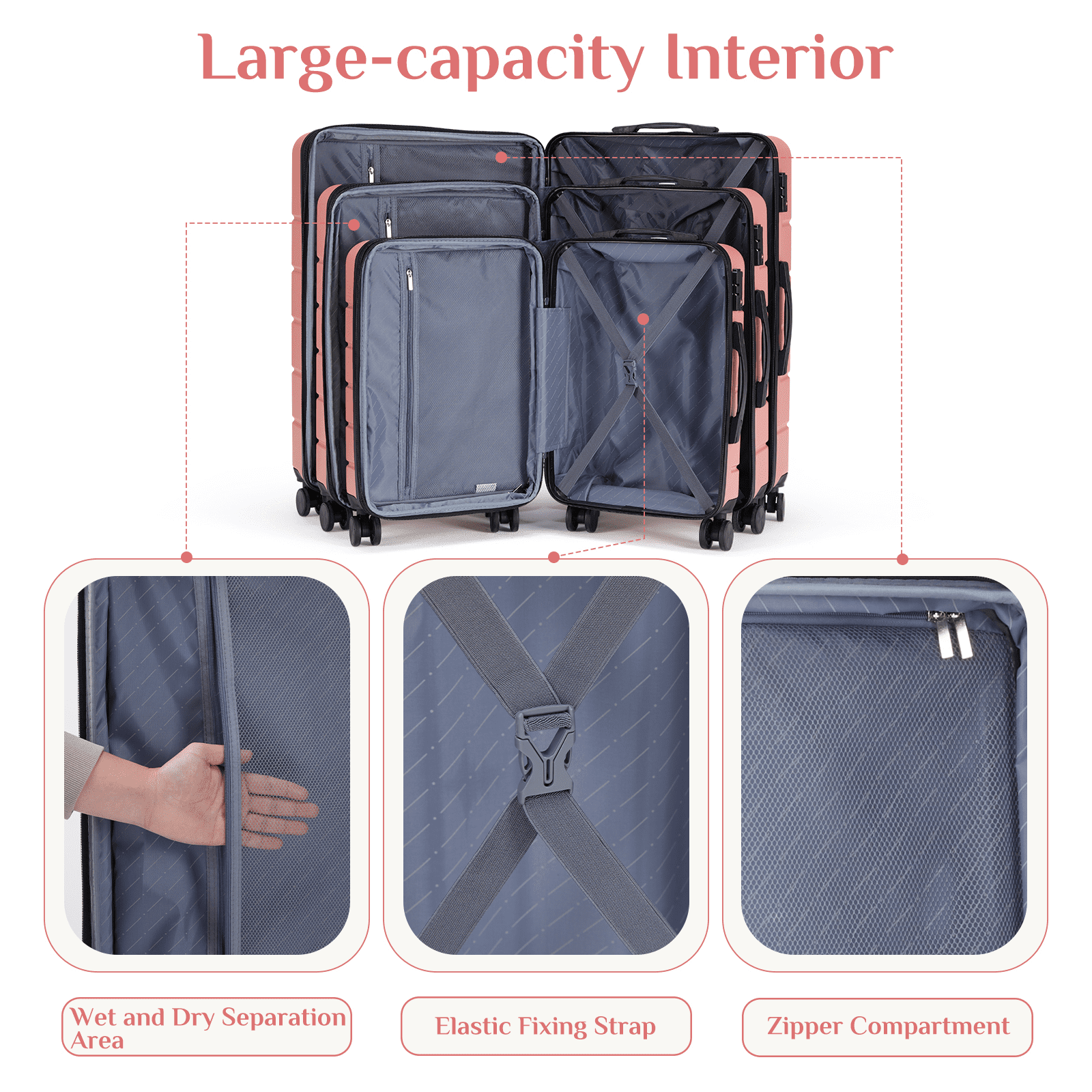- 【Adequate Internal Space】The interior of suitcases with wheels features crossed fixing band and net pockets to keep your travel essentials and small valuables well organized.Low profile top and side handle provide for ease in handling,making your trip happy and worry-free.
