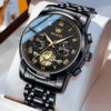 Olevs OLS2859 men’s Chronograph watch black dial is 41 mm in diameter, 11 mm in thickness, 127g weight, water-resistant to 30 meters, scratch resistant mirror, luminous hands, date window, 19 cm watch band fits up to 7.4-inch wrist circumference, and the tool for adjusting the band length and manual is included in the package.