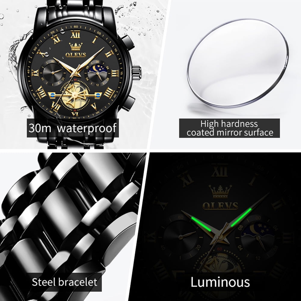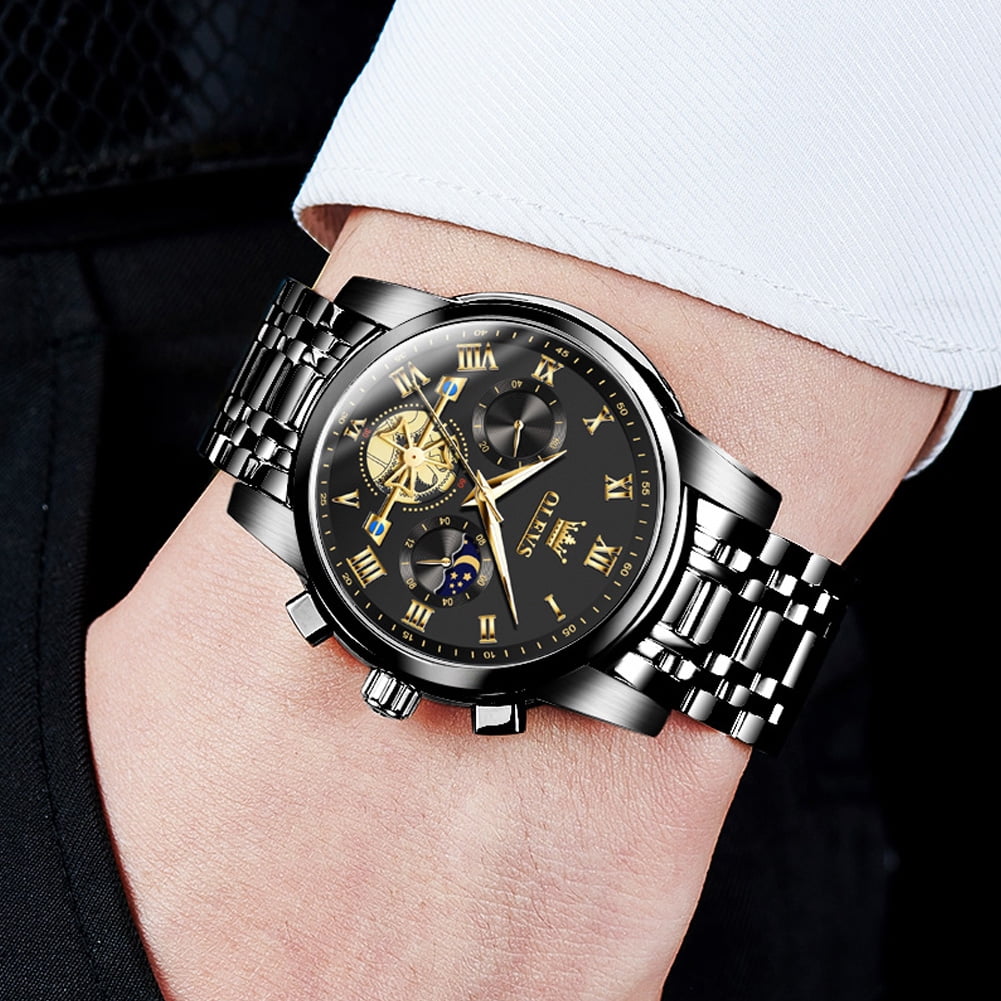 ⌚Multifunctional Men Watch:Male watch a chronograph with three sub-dials, showing 60 seconds, 60 minutes, moon phase, and a calendar window display on the right. The design style is simple, business, classic and generous.