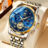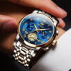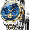 Olevs OLS2859 men’s Chronograph watch blue dial is 41 mm in diameter, 11 mm in thickness, 127g weight, water-resistant to 30 meters, scratch resistant mirror, luminous hands, date window, 19 cm watch band fits up to 7.4-inch wrist circumference, and the tool for adjusting the band length and manual is included in the package.