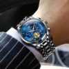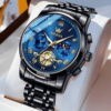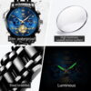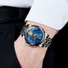 Olevs OLS2859 men’s Chronograph watch blue dial is 41 mm in diameter, 11 mm in thickness, 127g weight, water-resistant to 30 meters, scratch resistant mirror, luminous hands, date window, 19 cm watch band fits up to 7.4-inch wrist circumference, and the tool for adjusting the band length and manual is included in the package.