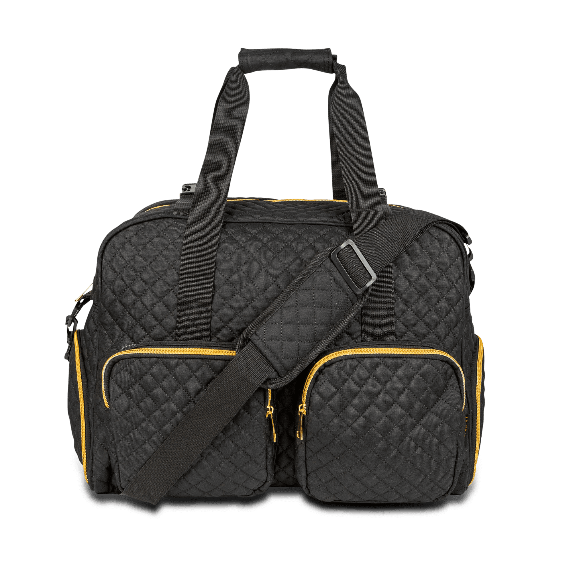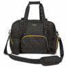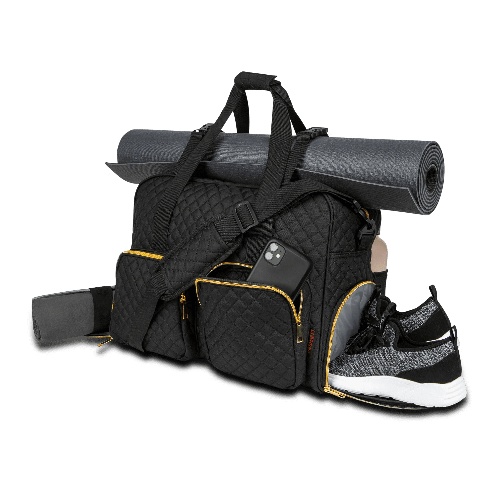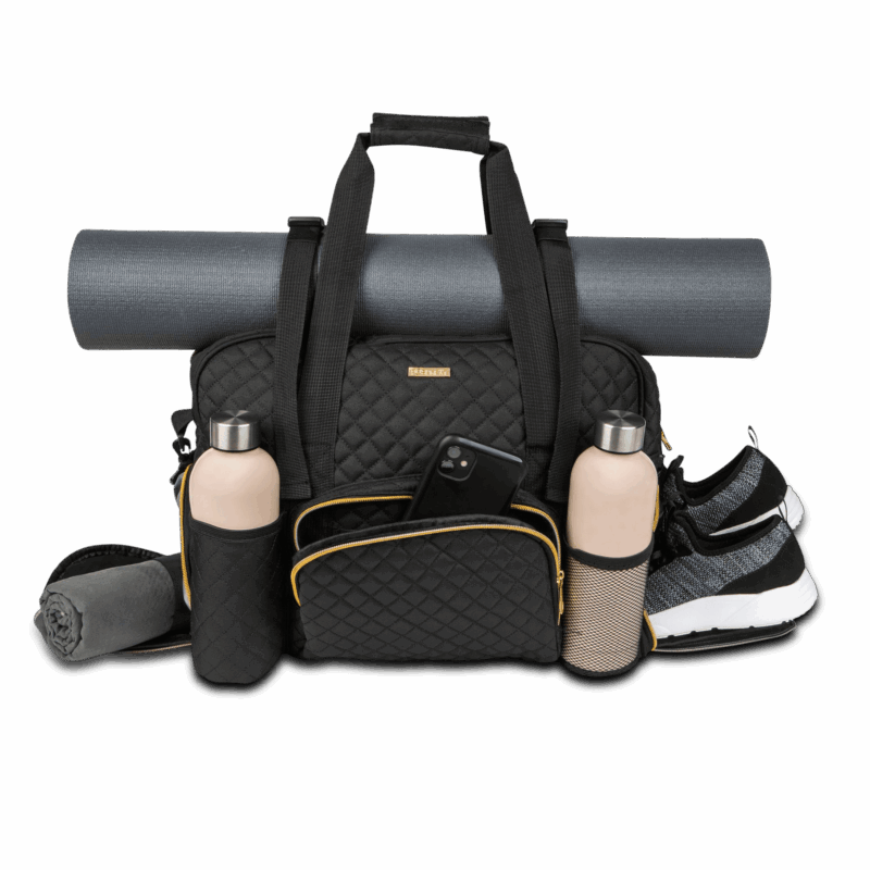 Gym, travel, and all-purpose companion for women. Perfect organization tool. The large main compartment can easily store your gym or travel necessities. Never worry about your shoes touching your clothing again because they have a separate compartment. Worn personal items and damp accessories like swimwear and wash cloths have a waterproof storage pocket. Need a place to store your exercise mat while traveling to the gym or out of town? We’ve got you covered! Store your keys, wallet, id, and cell in either the interior or exterior zippered pockets for quick & easy access. These multiple storage options make this fitness/ travel duffel perfect for the gym, dance, cheer, ballet, soccer, softball, or a variety of other uses. An adjustable & detachable shoulder strap is provided for hands-free carrying. The bag dimensions are 18″ x 9″ x 12″ which is perfect as an airline personal item.