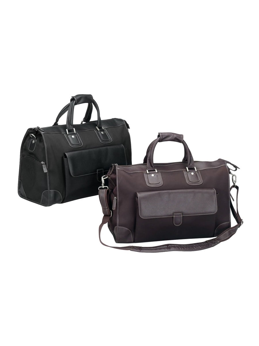 The Commuter Bellino Duffel is made of cotton twill and heavy duty leatherette. Its ability to open wide makes packing a pleasure. There are three open elastic pockets, as well as a zippered pocket on the interior. There are dual side-zip pockets and a flap with a magnetic snap closure in the front of the bag. There is a soft grip handle and a detachable shoulder strap to help carry this duffel.