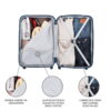 - Dimensions including wheels: checked luggage 27.8″ x 16.9″ x 11″, carry-on 22″ x 14″ x 9″