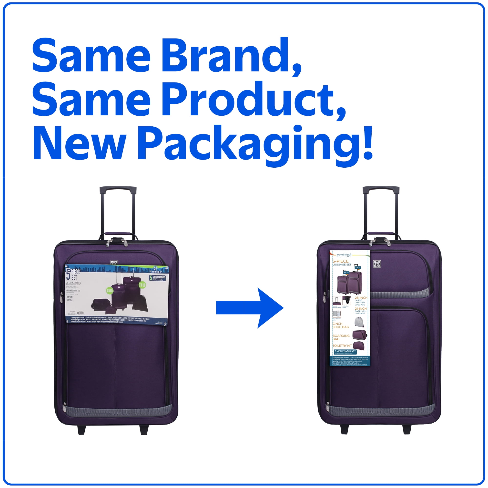 Make packing for your vacation simple with this Protege 5 piece luggage set. This set includes the perfect sized piece regardless of your travel needs. Included are a 28-inch upright, 21-inch upright, convenient boarding tote, a matching toiletry kit, and a cinch sack for packing all of your personal belongings. The larger bags include 2 in-line skate wheels and sturdy handles for easy transportation. This five-piece value luggage set is available in either black or purple material and offers cutting edge functionality combined with contemporary aesthetics.