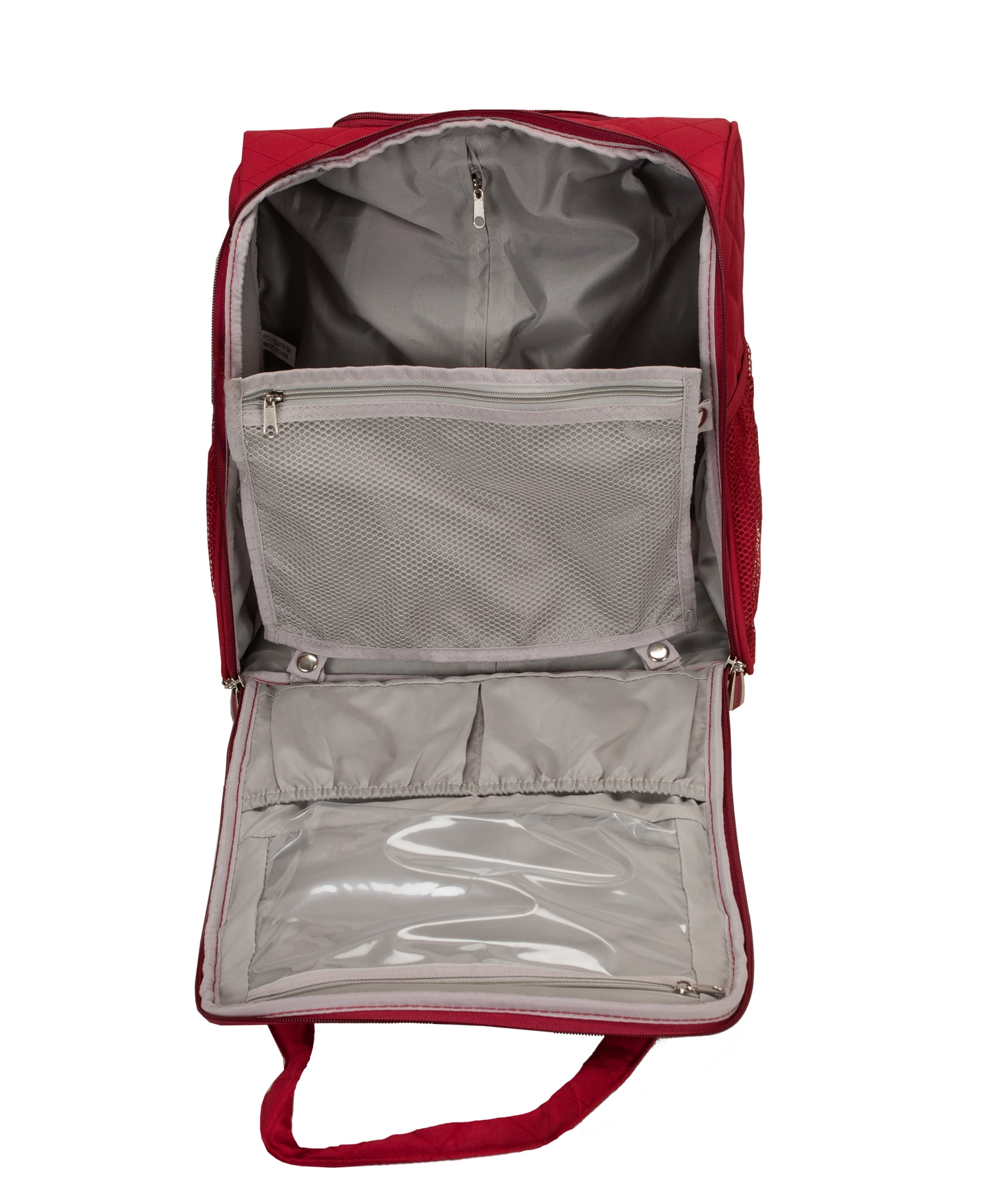 Carry all your essentials in style and comfort with the Rockland Wheeled Underseat Carry on Bag. Quilted polyester fabric exterior features a large main compartment for clothes, shoes and also has 2 slip pockets and two zippered pockets for keeping small essentials handy and organized. Retractable handle stores away while hand held handles allow for quickly grabbing bag from overhead bin or underneath seat. Back side has a strap allowing you to attach it to your wheeled carry on piece. This makes the perfect bag fro overnight trips and the small size fits undernear most airline seats allowing you to carry on your bag even when overhead bins are full. Measures 15″H x 14″w x 9″L (interior dimension 8″x13″x8″).