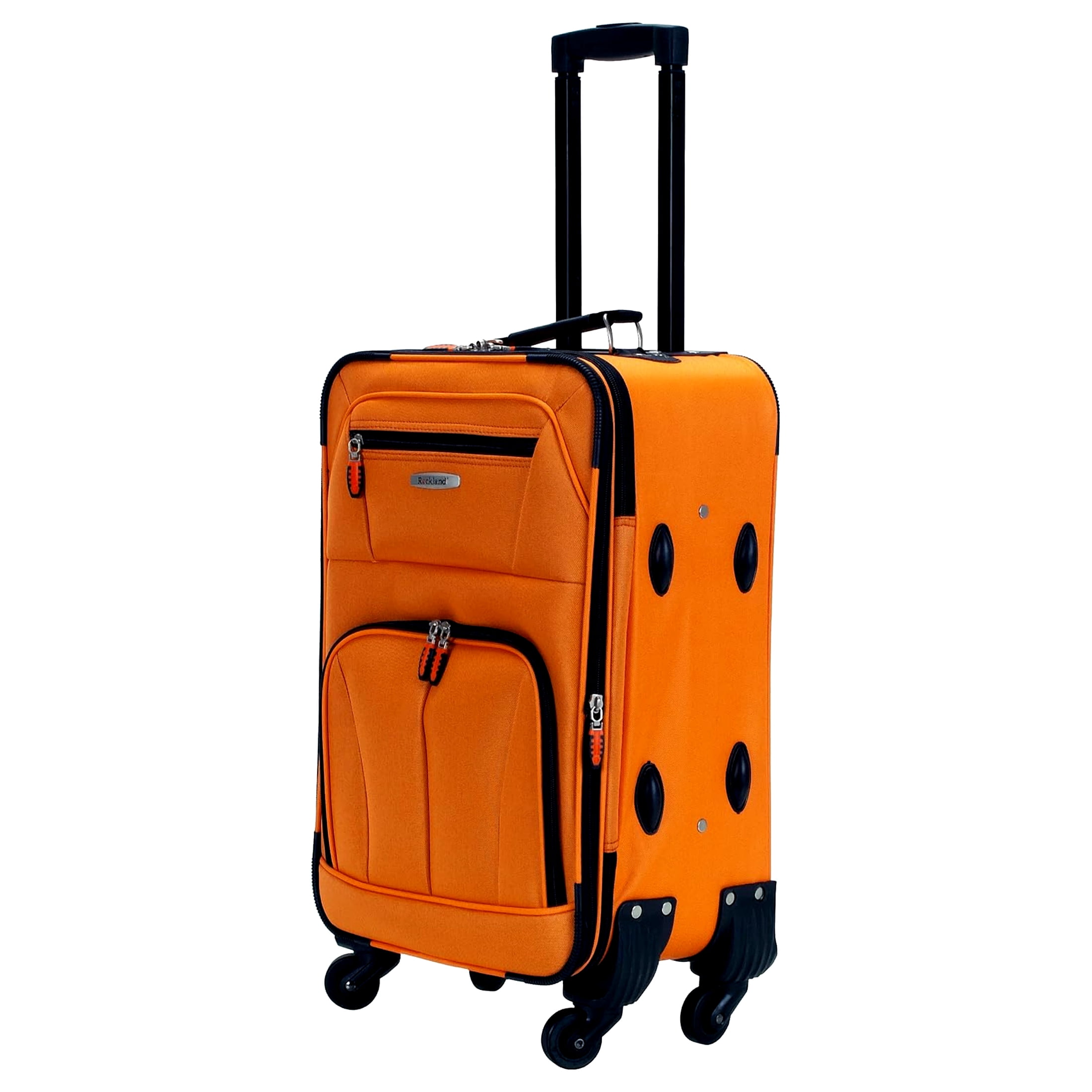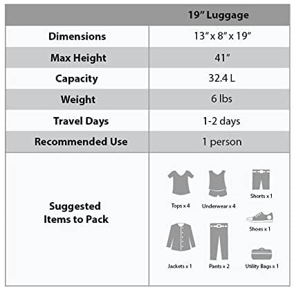 Four multi directional spinner wheels rotate 360 degrees for easy maneuverability. This luggage allows you to pack more while avoiding the excess weight surcharges imposed by most airlines. • Multi-directional spinner wheels for easy maneuverability • Modern internal aluminum telescoping handle with push button handle. • Interior mesh and zip pocket and elastic pocket * 5 year warranty * 19″X13″x8″ weighs 9 lbs,