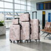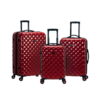This 3 pc. Set is made of polycarbonate/ABS. Polycarbonate is the same material used to manufacturer bullet proof glass. This material is extremely lightweight, durable, and protects the contents of your luggage. Eight multi directional spinner wheels rotate 360 degrees for easy maneuverability. This luggage allows you to pack more while avoiding the excess weight surcharges imposed by most airlines. 20″X13″x9″ weighs 6 lbs, 24″ x15″x10″ weights 8 lbs, 28″x17″x12″ weighs 10 lbs.