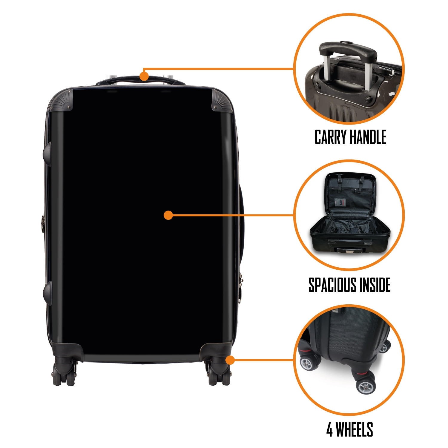 THE ‘WEEKEND GETAWAY’ – MEDIUM SIZE: • Size: 68cm x 42cm x 25cm (check-in for normal people, or anywhere on your private jet) • Weight: 4.1kg • Capacity: 80L – Keith Moon weekend drinking capacity! • Hardcase • Polycarbonate shell • High-definition graphics • Side-mounted TSA locks • Top and side carry handles are included for easy lifting • Internal alloy telescopic handle with push button system; adjustable to a variety of heights • multi-pocket 210D lining with internal elastic straps • 4 Double swivel wheels • Includes a non-woven polypropylene dust storage cover. • 2 Year Warranty