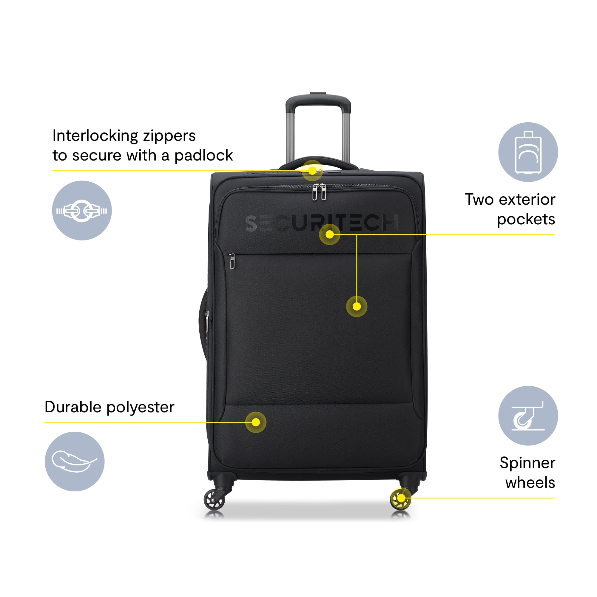 The Securitech Vanguard 32″ Large Softside Checked Spinner Luggage is tough, lightweight & has two exterior pockets for organization made simple. Designed for travelers who need extra flexibility without compromising durability, the Securitech Vanguard 32” Large Softside Checked Spinner is your go-to bag for week-long vacations, family trips, or business getaways. Tough, Travel-Ready Design: Made from durable, water-resistant polyester, this softside luggage combines lightweight construction with resilience—perfect for handling the bumps of busy travel days. Smooth Maneuverability: Equipped with 360° single spinner wheels, the Vanguard glides easily through airports, stations, and hotel lobbies. Smart Storage Inside & Out: The roomy interior includes tie-down straps and a large mesh pocket to keep everything organized, while two spacious exterior compartments give you quick access to travel essentials like chargers, jackets, or snacks. Extra Packing Room When You Need It: The expandable main compartment provides additional space to accommodate souvenirs or last-minute additions. .