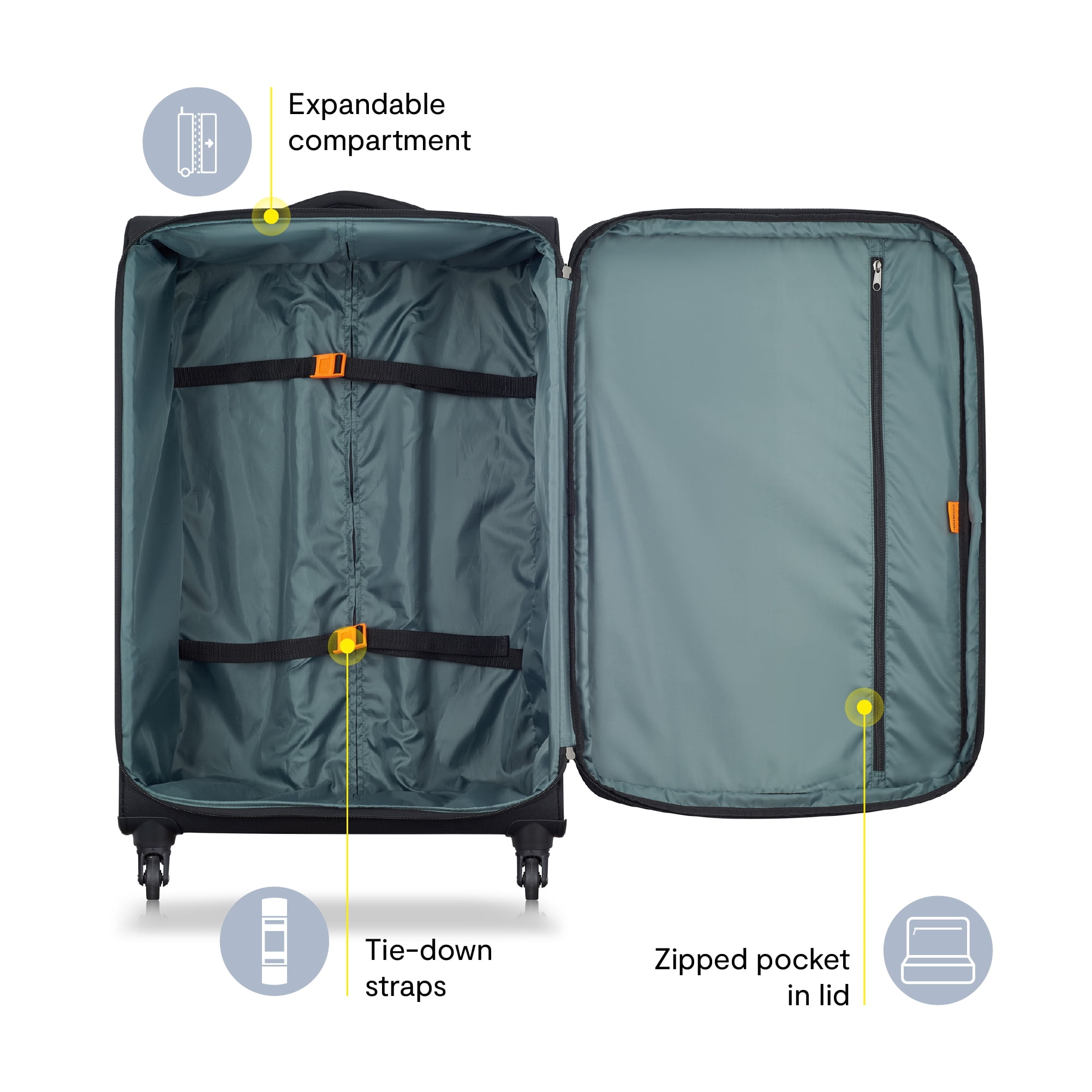 - 360° single spinner wheels for smooth, stable rolling