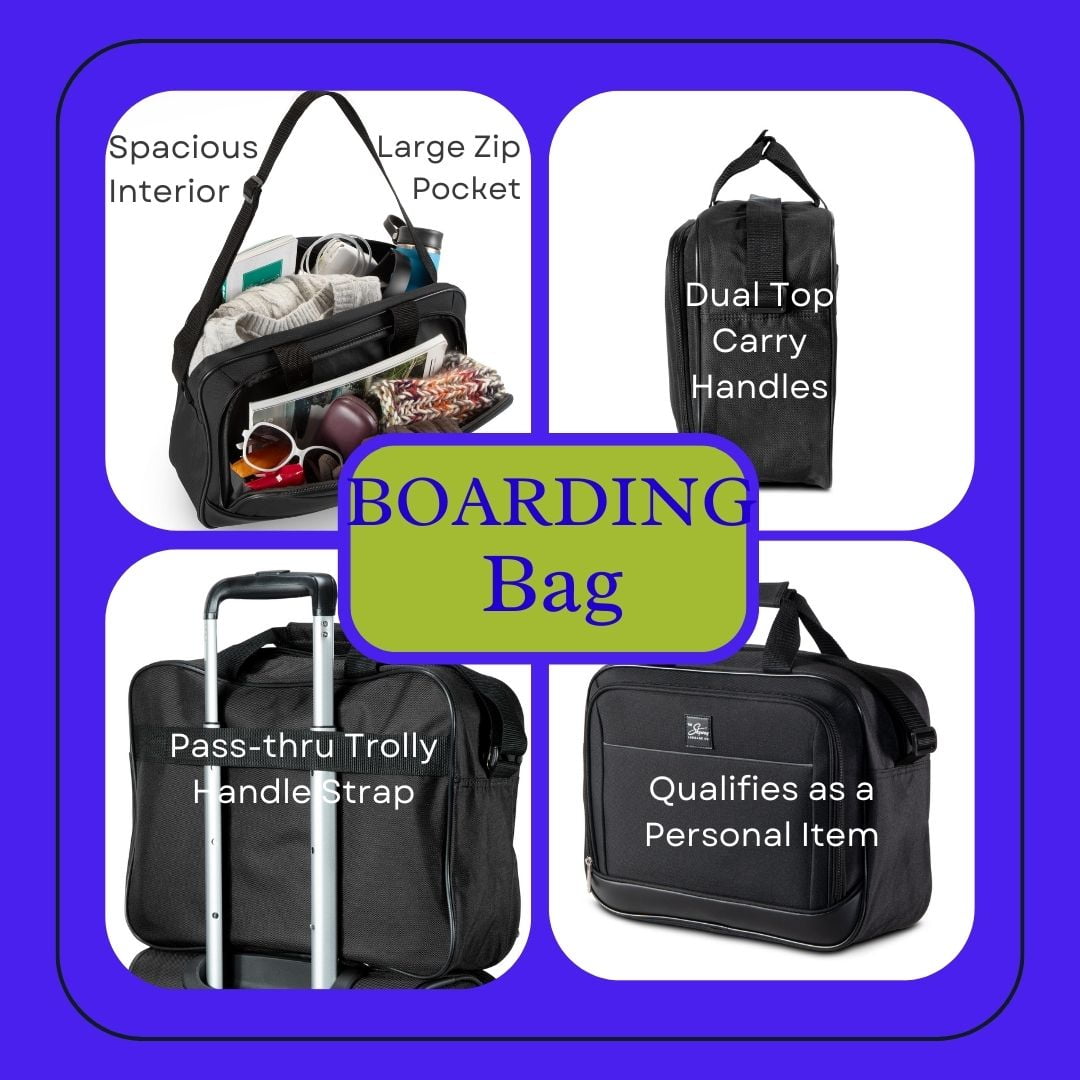 - Functional Boarding Bag: Made from weather- and abrasion-resistant polyester, this bag features dual top carry handles, an adjustable shoulder strap, and a pass-thru trolley handle strap. With an easy-access zip pocket and qualifying as a personal item, it’s the perfect companion for your travel essentials.