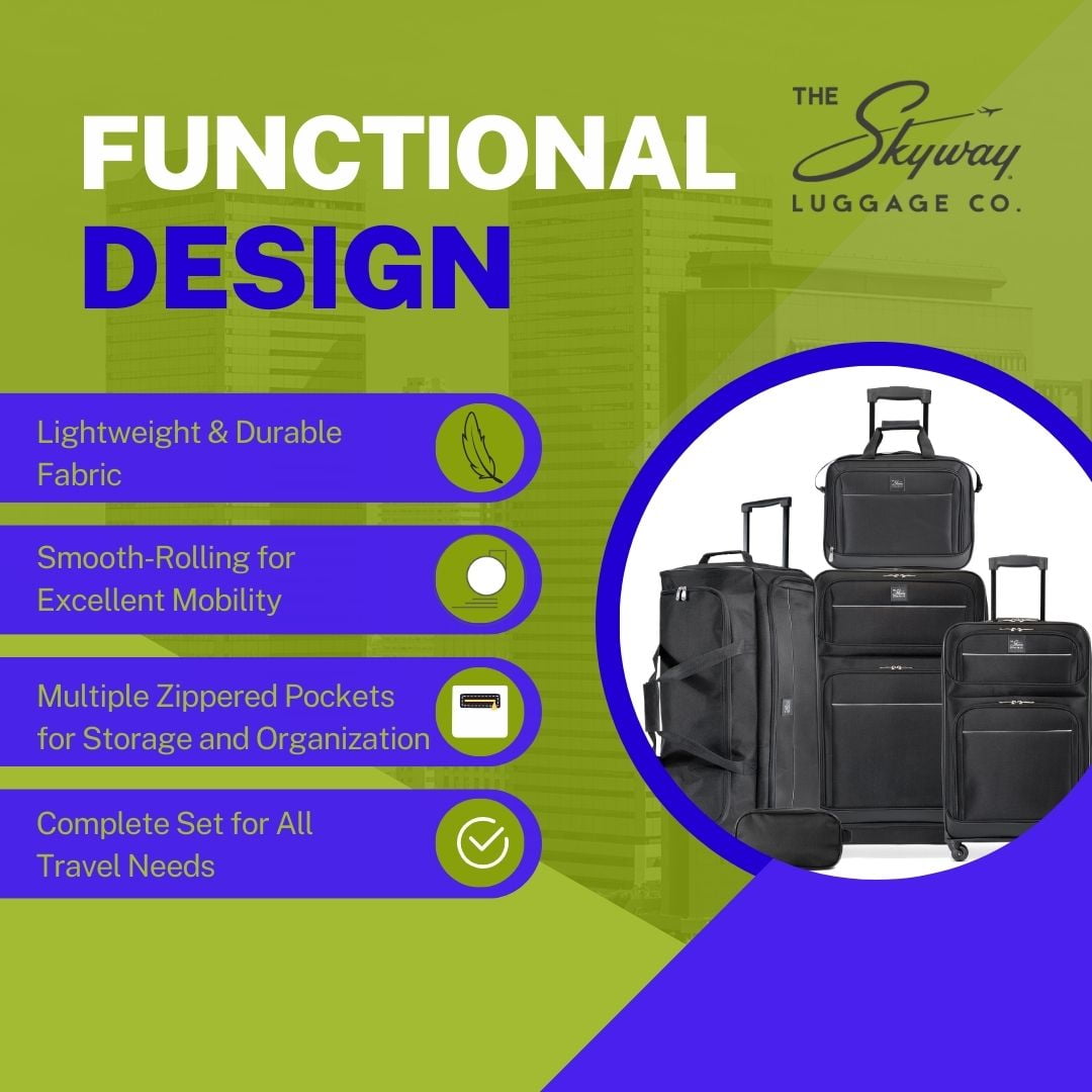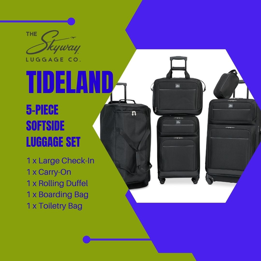 The Skyway Luggage Tideland Softside 5-Piece Travel Luggage Set has everything you need to travel in style and comfort. This versatile set includes a Carry-On, Large Check-In, Rolling Duffel, Boarding Tote, and Toiletry Kit, making it the perfect collection for any journey—whether it’s a weekend getaway with the family or a solo adventure. The generous capacity suitcases are equipped with a 360° spinner wheel system, offering smooth and effortless maneuverability. The rolling duffel features two in-line wheels for enhanced stability, while the boarding tote keeps your essentials easily accessible with its exterior pockets. The toiletry kit offers the ideal size for travel, keeping your toiletries organized and secure. Crafted from lightweight, durable 600 polyester fabric, the Tideland set resists abrasion and tearing, providing superior protection against the elements. Ready for any adventure, this set delivers the perfect balance of functionality, style, and durability for all your travel needs. Overall dimensions are as follows: Expandable Spinner Carry on: 19.5 in H x 13.5 in W x 8 in D Expandable Spinner Large Check in: 27 in H x 16.5 in W x 9 in D Rolling Duffel: 11.5 in H x 27 in W x 13 in D Toiletry Bag: 5 in H x 9 in W x 3.5 in D Boarding Bag: 12 in H x 16 in W x 5.5 in D.