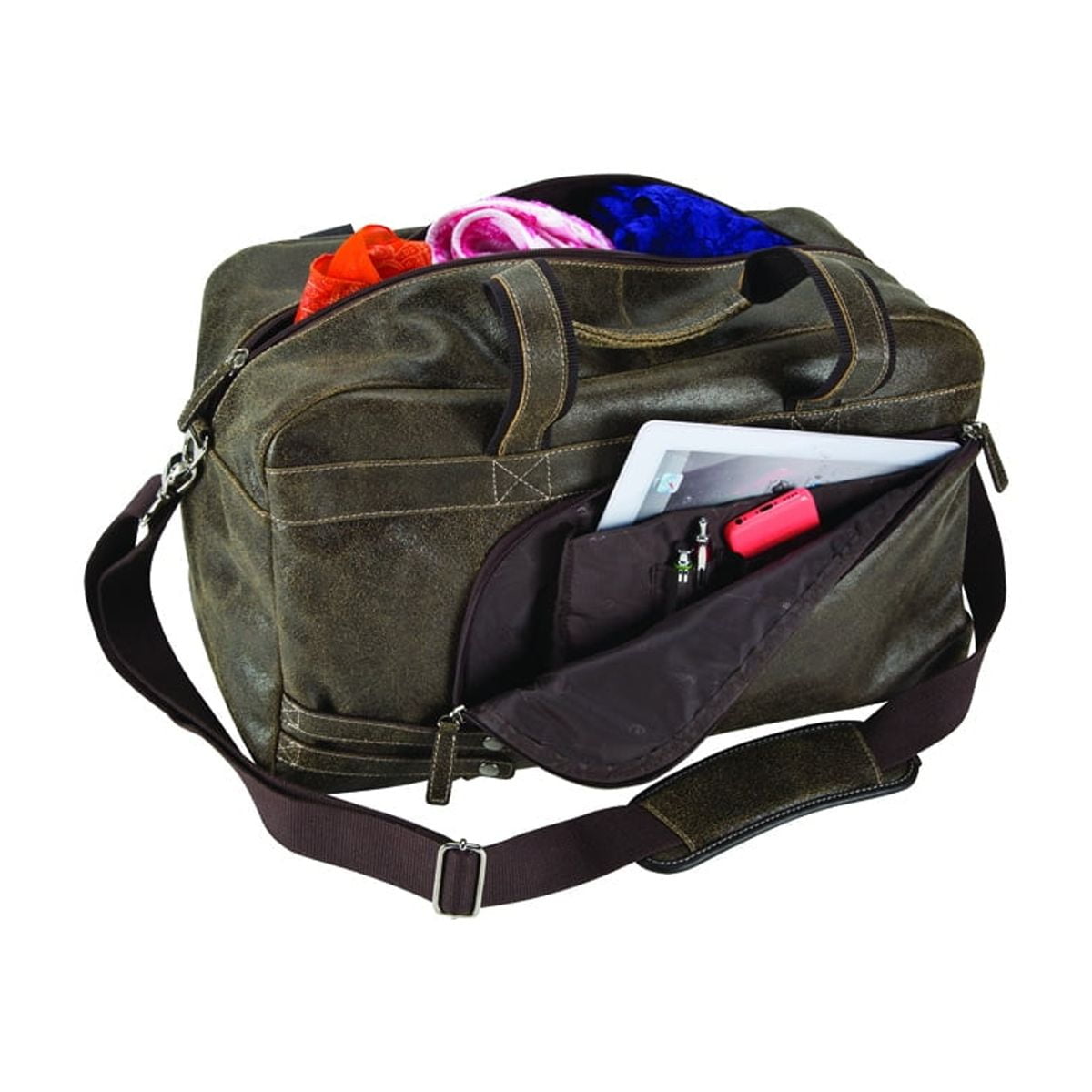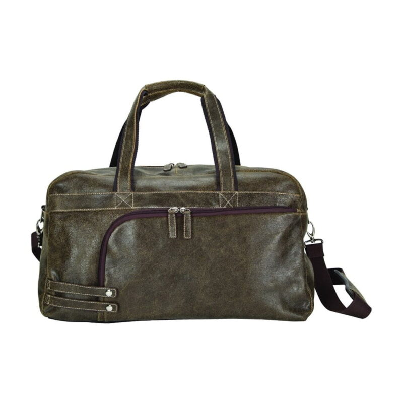 The Icon Leather Bellino Travel Duffel is made of distressed leather. Features include a spacious main compartment with a zippered pocket, a zippered pocket in front with a padded tablet pocket and multi-functional pockets, and a vinyl bottom that protects the duffel from the ground. There are dual soft grip handles and a detachable padded shoulder strap, and a webbed loop at the back to allow a perfect fit over a luggage pull-up handle.