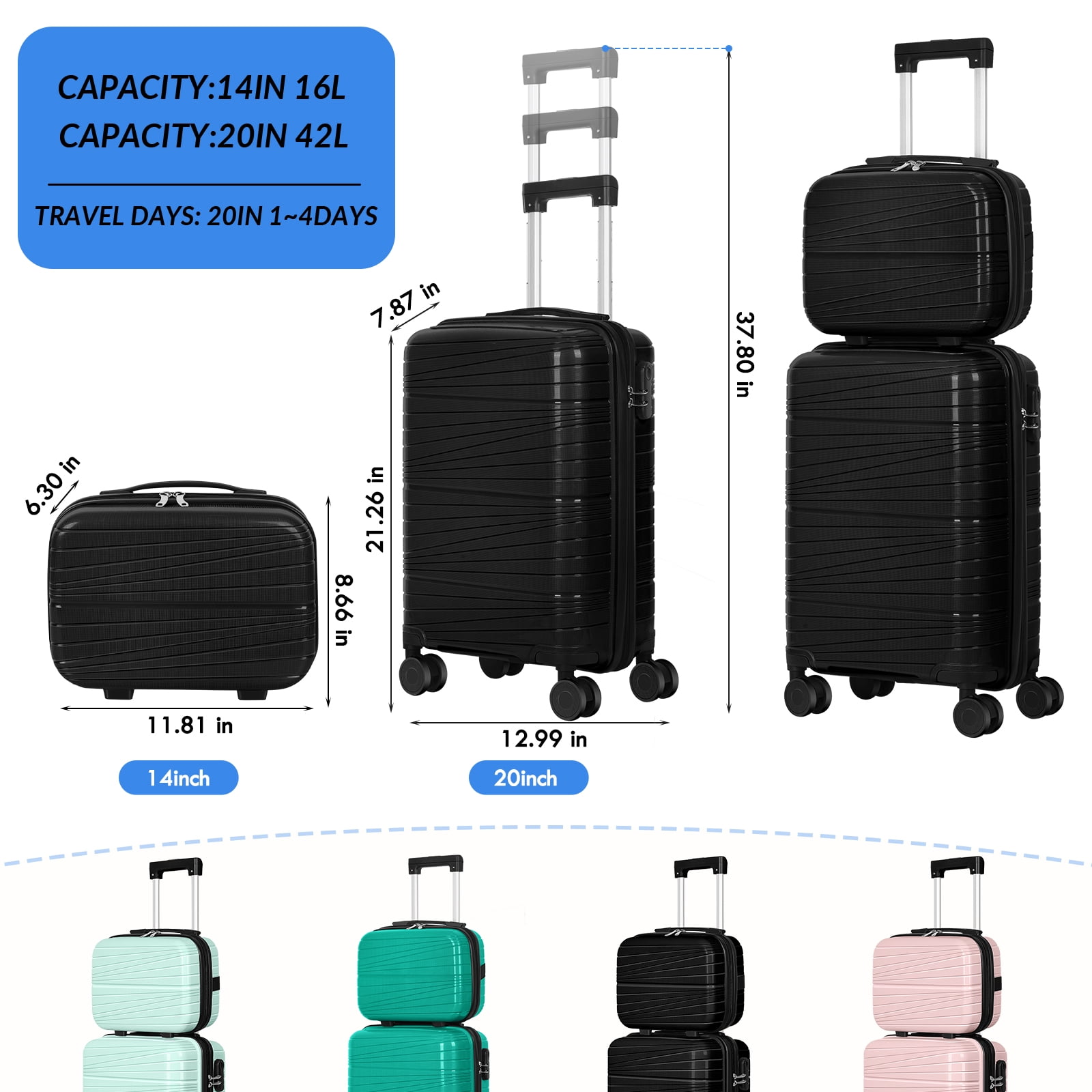 • COMPACT SIZE: This combo set luggage, 20 inch suitcase overall dimensions: 13.8IN X 9.1IN X 22.4IN, suitable for 1-5 days journey.14 inch suitcase overall dimensions: 18.1IN X 7.9IN X 11.1IN, suitable for 1-5 days journey.