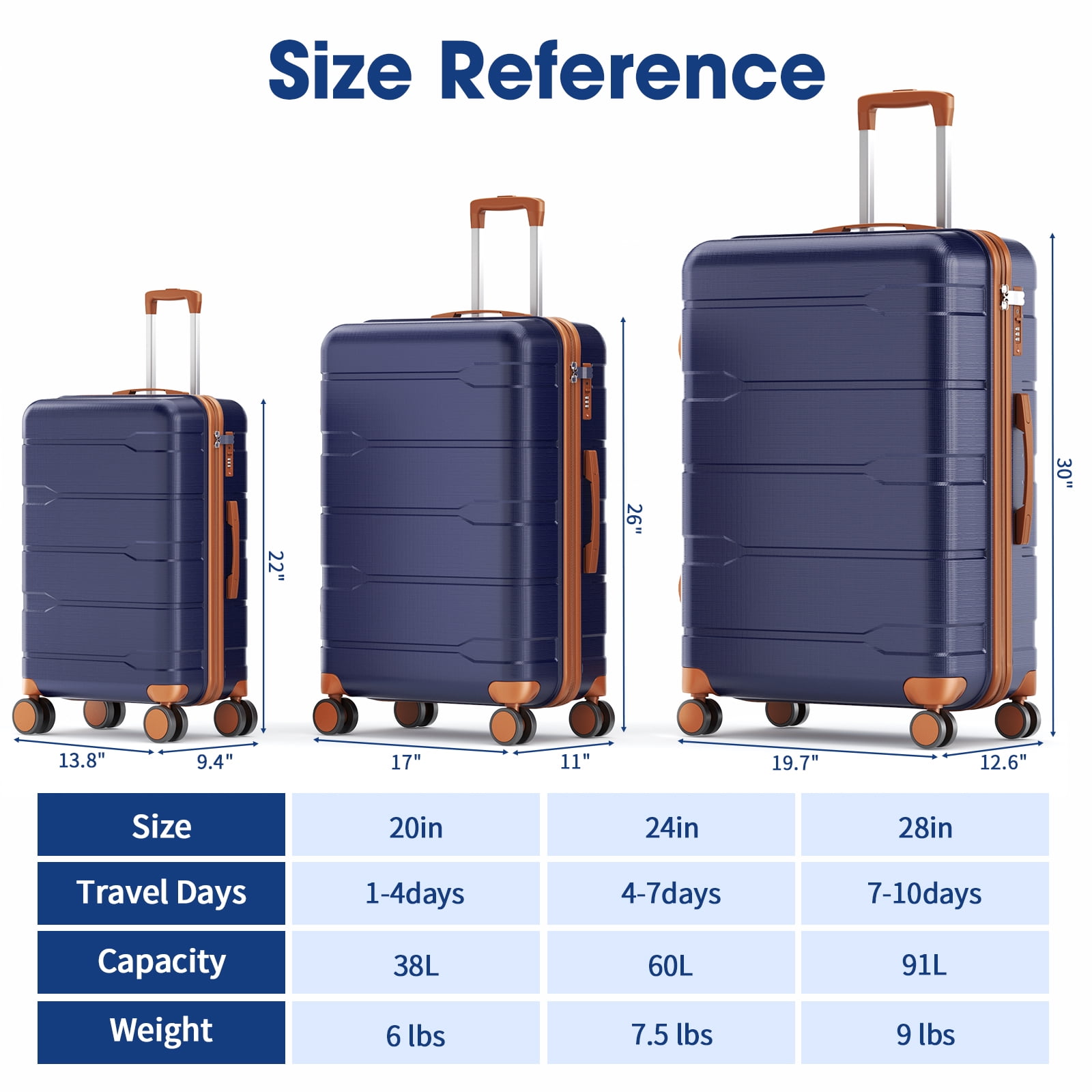 This set includes three versatile sizes: a 20-inch carry-on for 1–4 day trips, a 24-inch checked suitcase for 4–7 days, and a spacious 28-inch suitcase ideal for 7–10 day journeys. Smooth 360° spinner wheels ensure effortless maneuverability in airports and crowded terminals, while the aluminum telescopic handle adjusts comfortably for travelers of different heights.