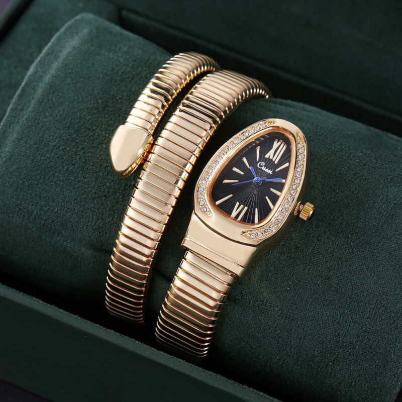 - Elegant Wrap Bangle Design – Snake-style wrap bracelet watch that blends jewelry aesthetics with everyday timekeeping.