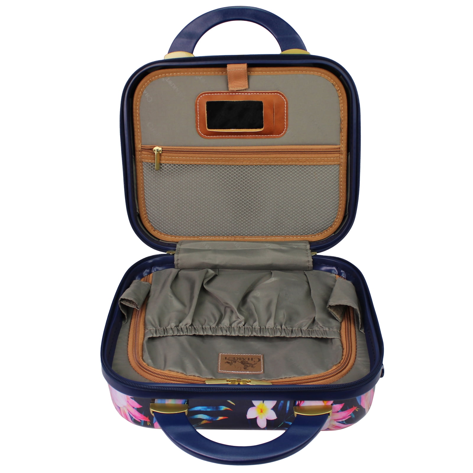 • The Interior features a zipper divider, a flap divider with a zipper pocket and mirror, and an elastic pocket for accessories