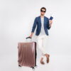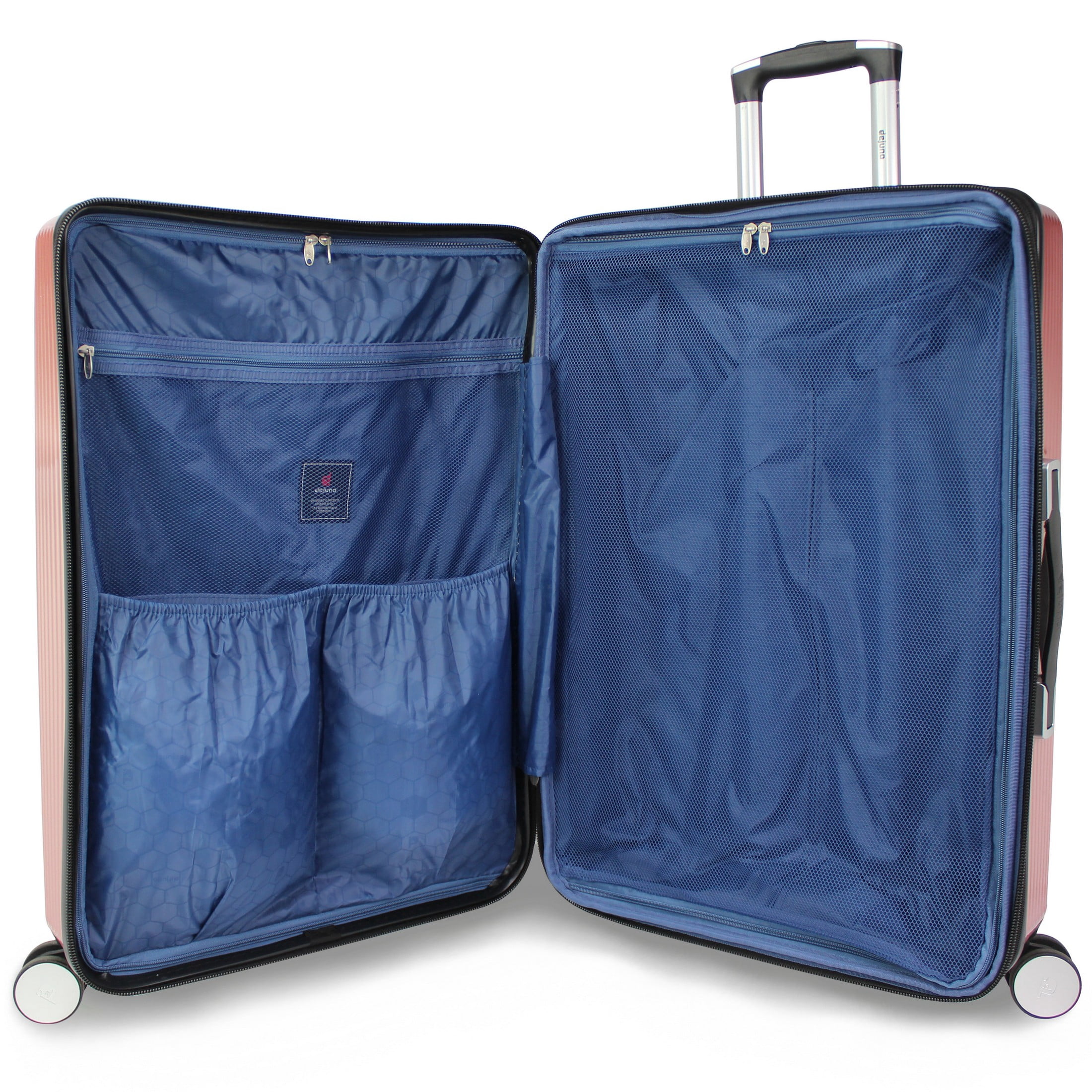 - Enjoy effortless mobility with eight spinner wheels and a push-button retractable handle