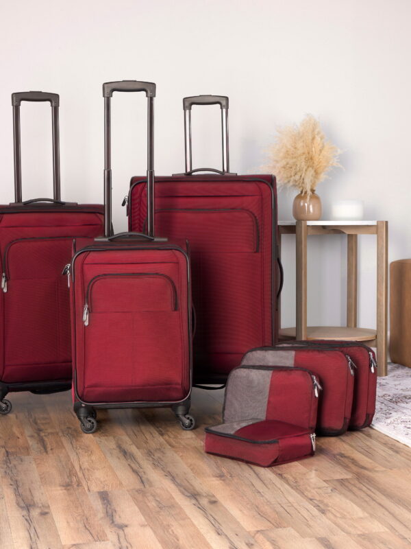 • Protege 7-Piece Softside Luggage Set with 360 Spinner Wheels and Divider Pockets, Includes 28" and 24" Upright Checked Bags, 20" Carry-On, 4 Packing Cubes, Merlot Red