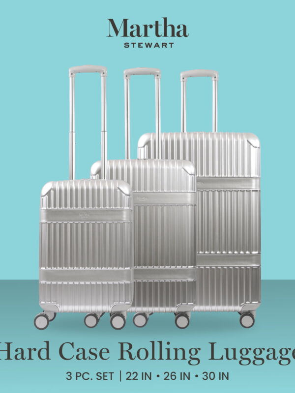 • Martha Stewart The Bedford 3 Piece Rolling Luggage Set, Hardshell Suitcases with Spinner Wheels, 22/26/30 Inch, Silver